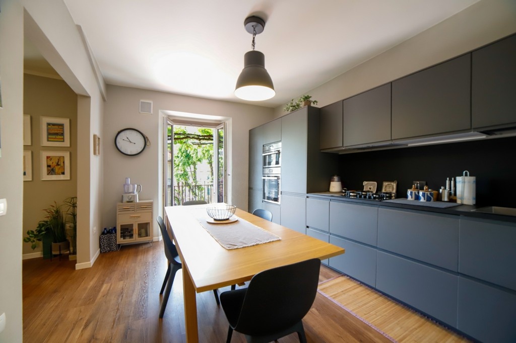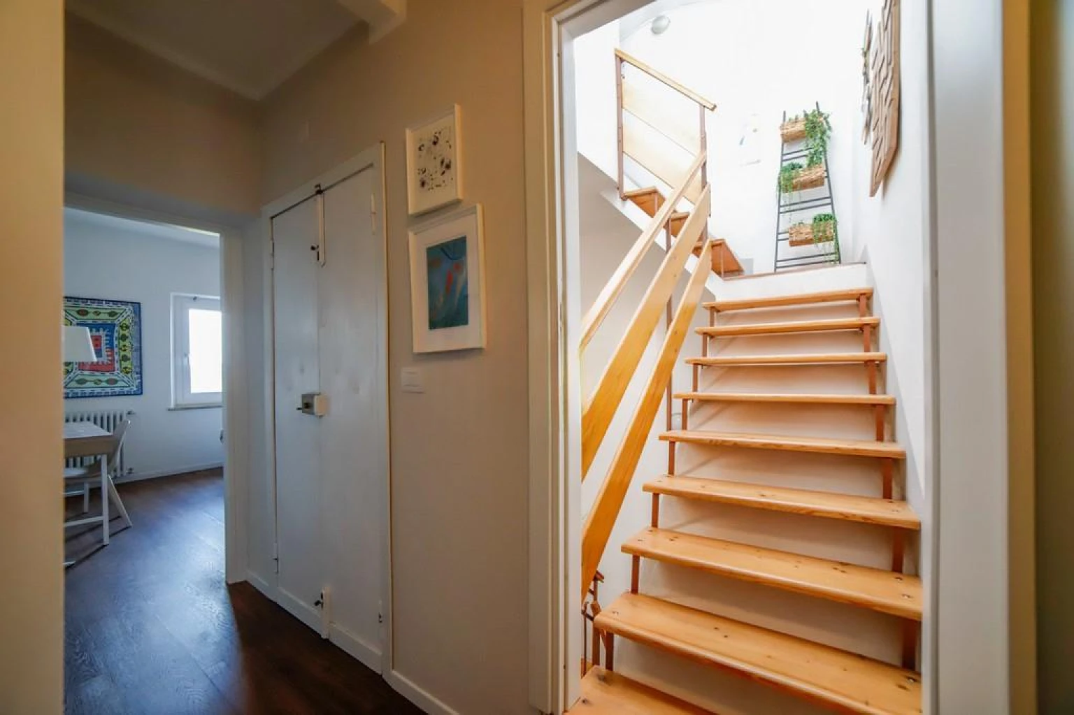 Mas a casa ainda reserva surpresas. Subindo ao andar superior, um refinado sótão, iluminado por claraboias, foi transformado em um ambiente multifuncional: um escritório-sala perfeito para trabalhar ou relaxar, um segundo banheiro com lavanderia e armários sob medida que aproveitam cada espaço.