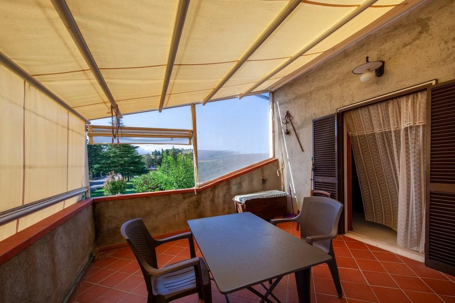 O interior apresenta uma divisão clássica e funcional: Com 130 metros quadrados é composto por hall de entrada, uma sala de estar com lareira, uma cozinha com espaço para refeições conectada a um grande terraço, recentemente coberto com toldos retráteis, que o tornam um espaço exterior utilizável e prático; além de um cômodo depósito amplo e conveniente.