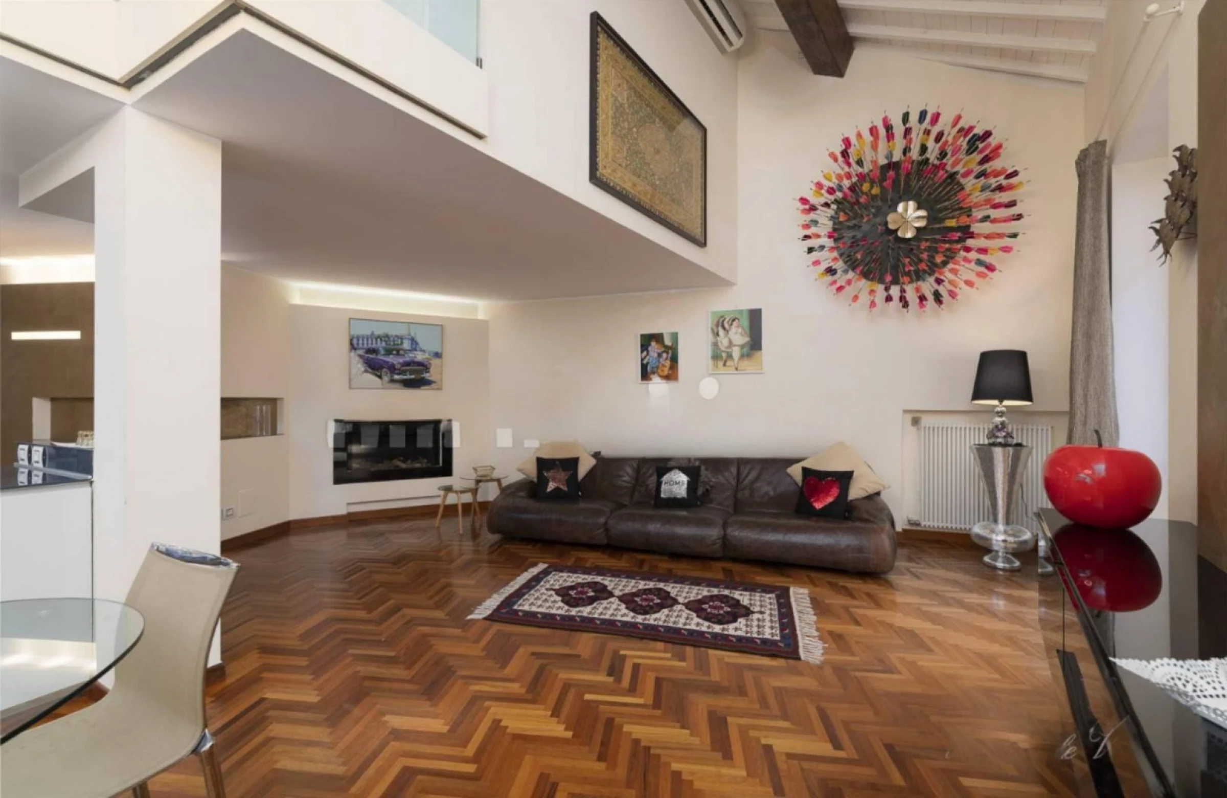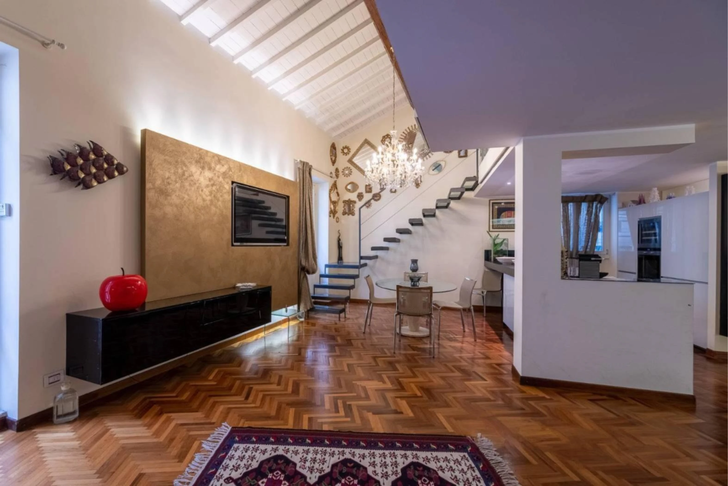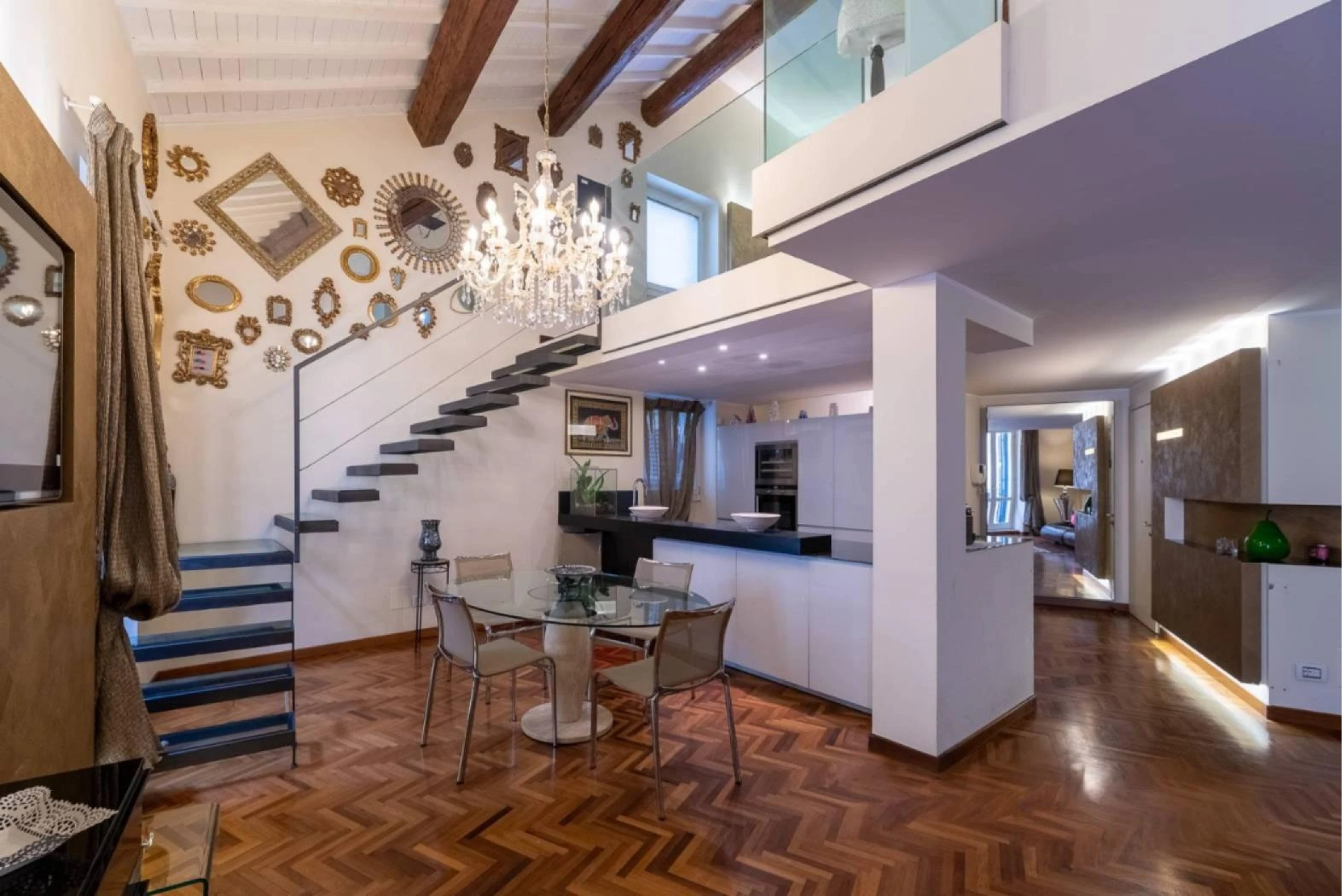 O imóvel, com aproximadamente 115 m², é composto por entrada com banheiro para hóspedes, ampla sala de estar com cozinha integrada e varanda com vista parcial para a Piazza Brà. Uma escada interna de vidro leva ao mezanino, onde há um quarto e um segundo banheiro com chuveiro.