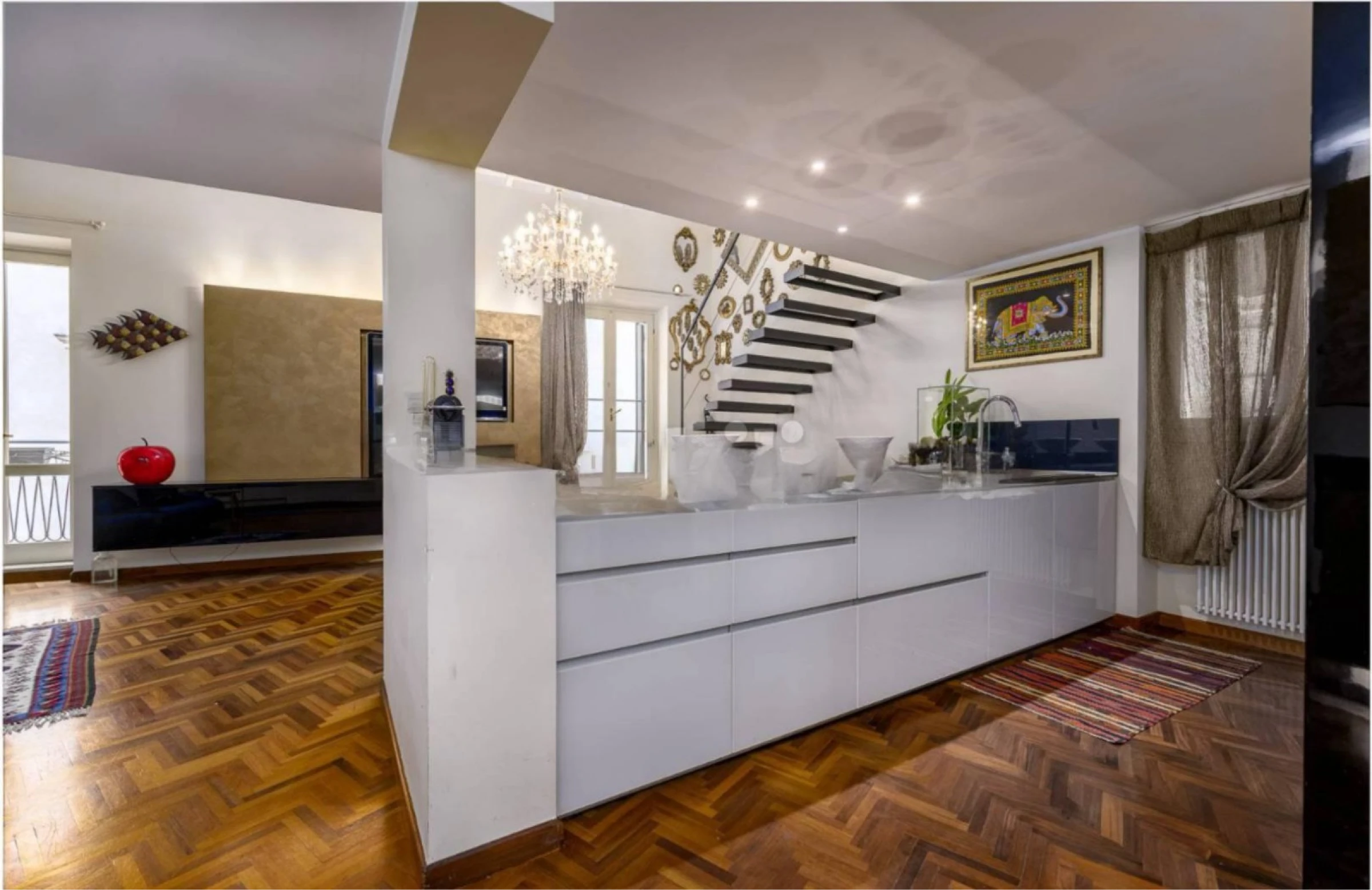 Apartamento elegante de dois cômodos em edifício histórico próximo à Praça Santa Anastasia, com varanda e garagem individual disponível.